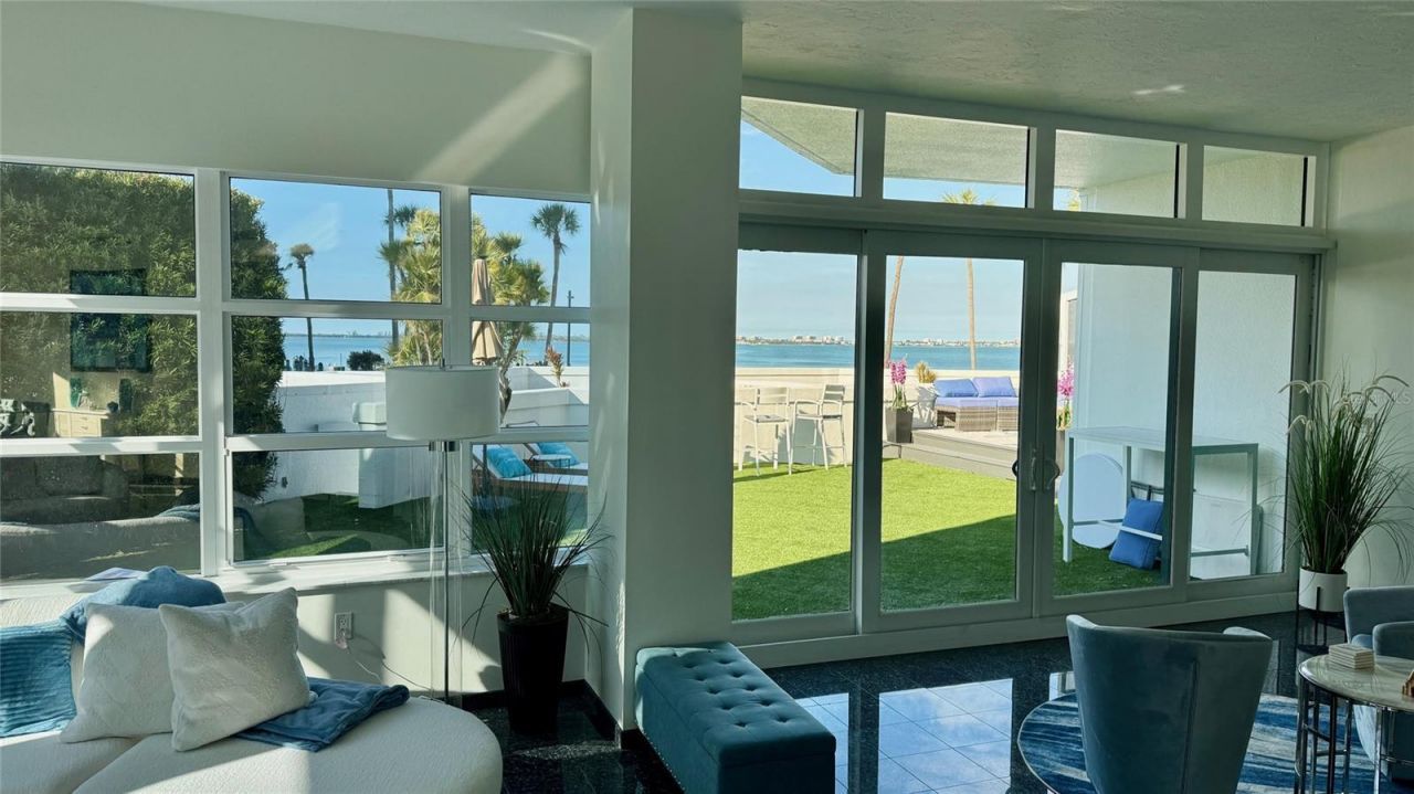 BIGGEST Water-View & BIGGEST UNIT in the entire community. PRIVATE OUTDOOR LIVING area with PET-FRIENDLY Astroturf. FULLY-RENOVATED with 10' HIGH CEILINGS. Low HOA. No Assessments. HIGH & DRY. The private terrace has private gated access down to all amenities, including 2 Heated Pools, 3 New Fitness Centers, 2 Saunas, and 2 Marinas with available BOAT SLIPS and Boat Lifts. TWO KITCHENS! One Main Kitchen and another for catering to keep the Main Kitchen clean when entertaining. New appliances, never been used. LIKE A HOUSE ON THE WATER. You'll never need to use an elevator to get down to your boat and all of the new amenities. Condo On The Bay Towers BLOCK THE VIEW of the new Ritz Carlton towers to the east. DIRECT SUNSET VIEWS out over Sarasota Bay. Steps outside this GUARD-GATED community is the NEW 53 Acre Park called 'The Bay. Living here doesn't feel like you're in a city. It's like living in a tropical oasis. Yet you are only a short WALK TO Dozens of Local Restaurants, Local Entertainment, and a PUBLIX GROCERY Store, just a few short blocks away. Amazing view of the John Ringling Bridge, all lit up at night from inside this home. Photos cannot describe the actual water view. Call your agent to see this home today.